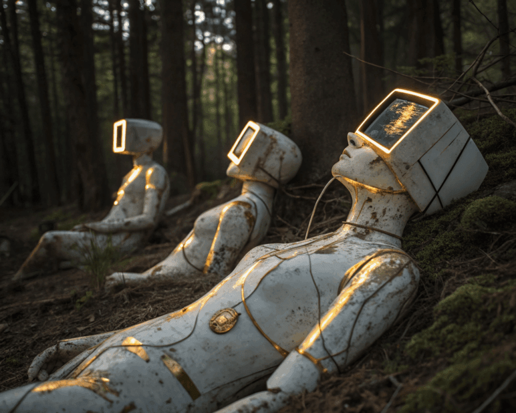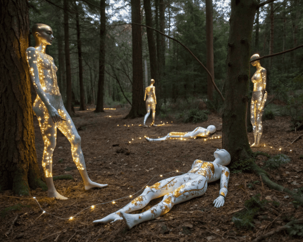 Figuras antropomórficas de superficie perfecta —seres sintéticos— abandonados a la intemperie de un bosque caótico.